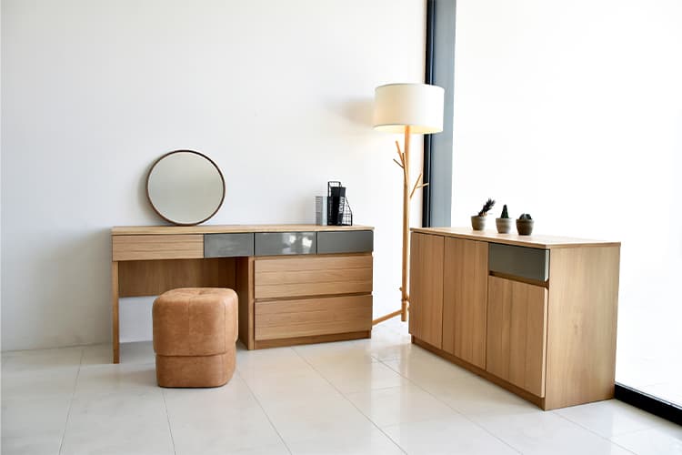 チェスト、デスク、キッチンカウンターなどバリエーションも豊富でお部屋に統一感を生み出します。 扉前板にはオイル塗装を施したオーク無垢材を。温かみのある雰囲気に!