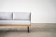 背面から見ても美しいオーク材のフレームと すっきりとしたスチールの脚で構成されたベーシックなデザインで、 さりげないヘリンボーンの織り柄のファブリックが シンプルなフォルムに奥行きを感じさせてくれます。