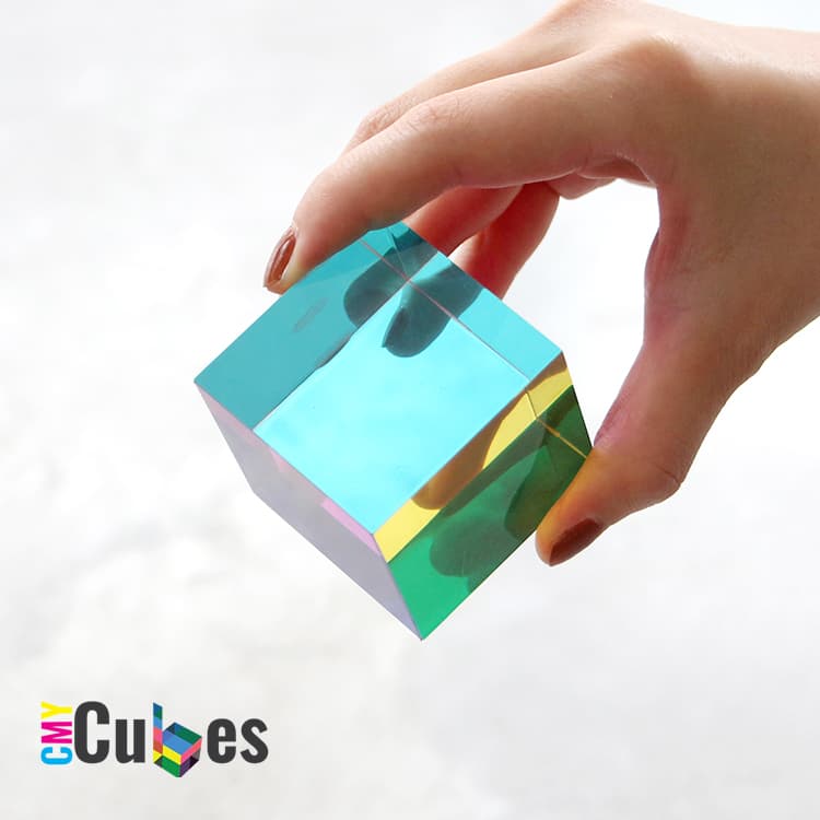 CMYcubes The Original CMY Cube 50mmは、CMY(シアン マゼンタ イエロー)のフィルムが光を通し、角度により重なることで美しい色を生み出すアートオブジェ。