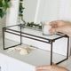 おしゃれなアイアン素材のフレームと、ガラス製の天板を組み合わせたインテリアラック。コの字型のディスプレイスタンドで見せる収納を